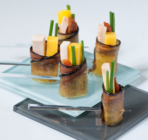 Roulés d'aubergine, mangue et volaille fumée