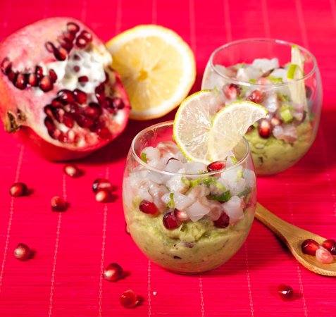 Garnissez vos verrines à mi-hauteur avec le guacamole et terminez avec le tartare de bar et grenade.
